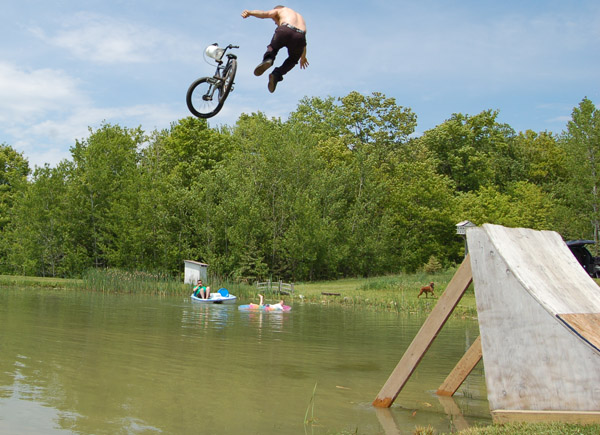 Bmx Plus had their annual Lake jump photo shoot at the Baker Family Memorial day picnic in Caroline center NY. Fisher showed up, and jumped in with his expensive clothes and brand new bike, and totally stoked out Hanson, who was covered in mud, and gravel from a previous incident….Sunburns and impending hangovers were gathered throughout the afternoon, as everyone drank cold ones and listened to classic rock. Jeremy Pavia was on hand to capture it all….